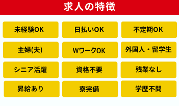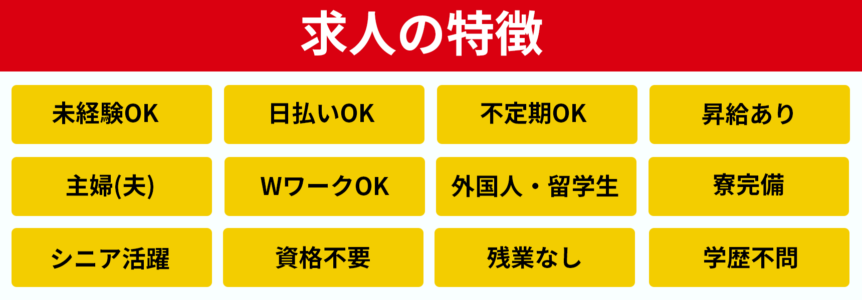 ■昇給あり ■資格手当あり ■試用期間なし ■法定研修(20時間) ■雇用保険・労災保険 ■副業OK(WワークOK) ■マイカー通勤OK、駐車場あり(現場による) ■制服貸与 ■直行直帰可能 ■日払い・週払いあり(規定あり) ■健康診断 ■寮完備 |