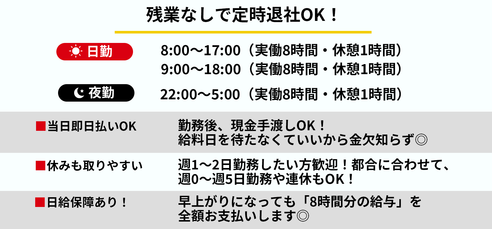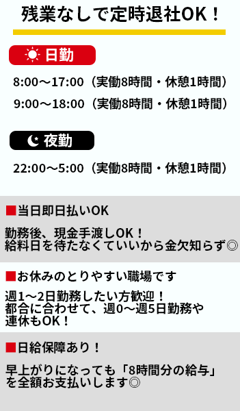 【日勤シフト例】 8:00~17:00(休憩あり) 9:00~18:00(休憩あり) 【夜勤シフト例】 22:00~翌5:00(休憩あり) ☆日勤・夜勤どちらも作業が終われば定時前に業務終了ですよ♪ |